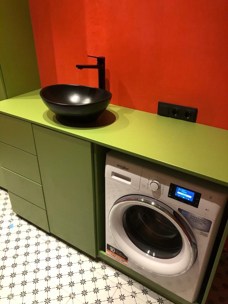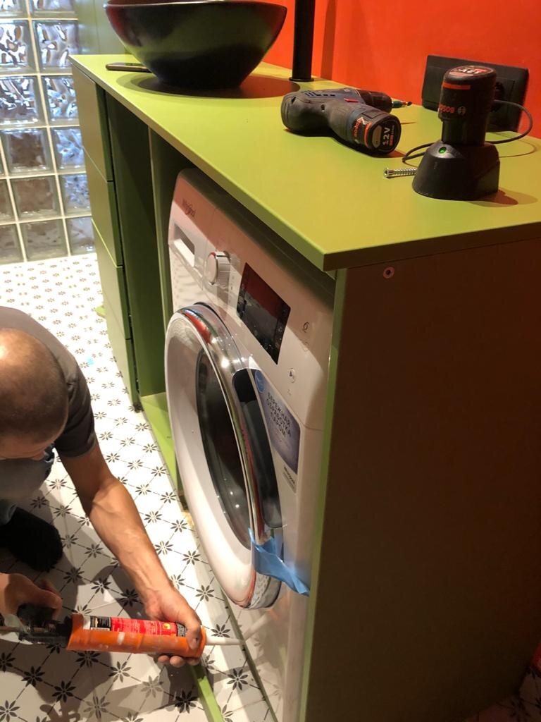 Стиральная машина whirlpool не встроенная, но встроенная в мебель. Ведёт себя прилично и не барагозит.
