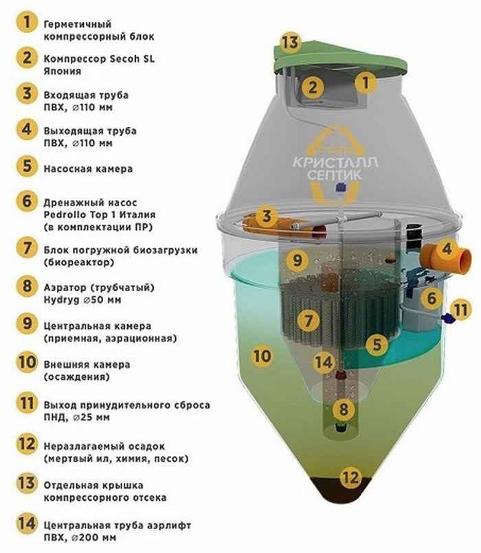 Теперь рассмотрим вкратце, какое устройство имеет септик Кристалл и как он работает.