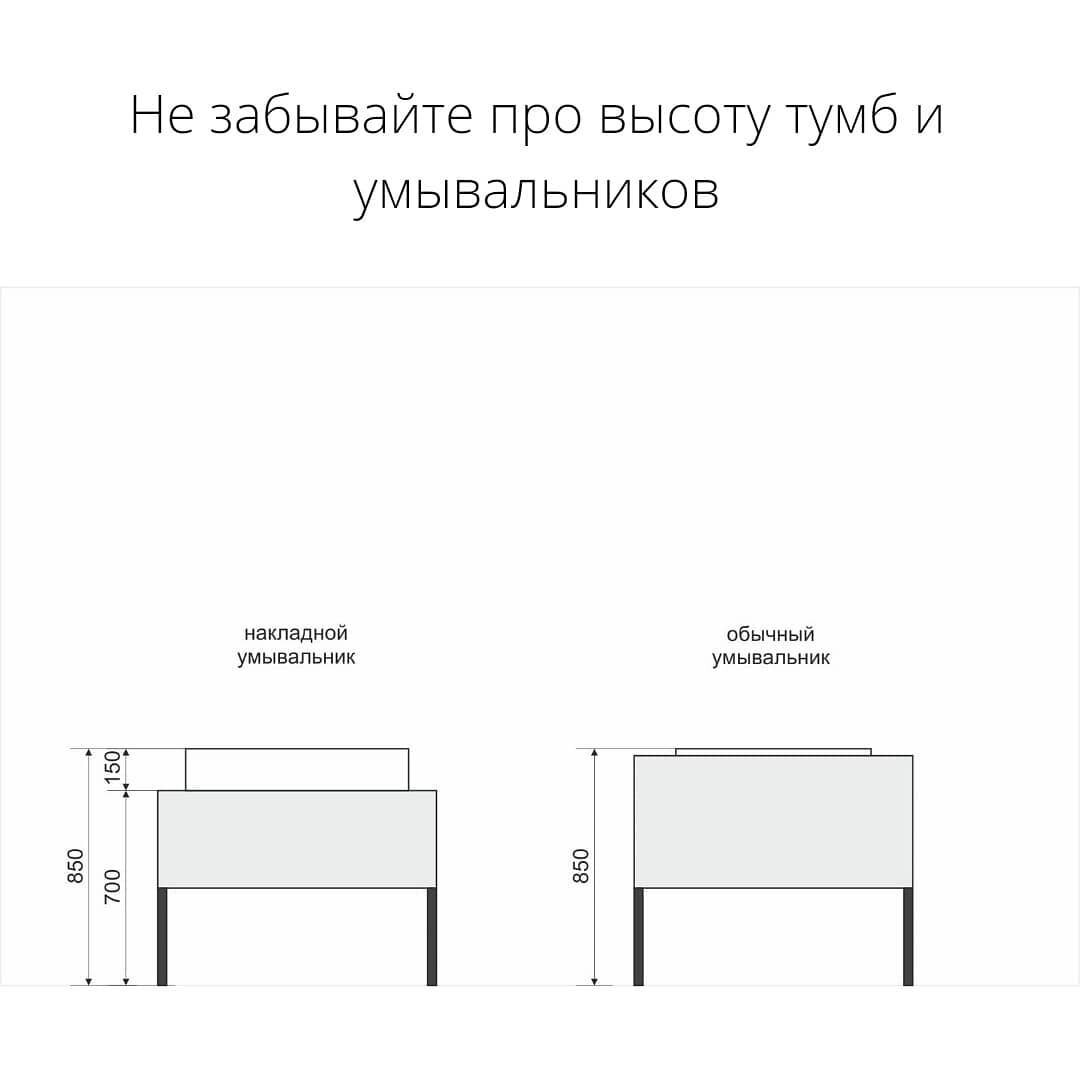 Правда здесь есть нюанс. Высота столешницы должна быть меньше, чем в стандартном исполнении с обычным умывальником. До края умывальника всегда должно быть в среднем 85 см. Это значит, если чаша высотой 15 см, то высота от пола до верхнего края столешницы должна быть 70 см.