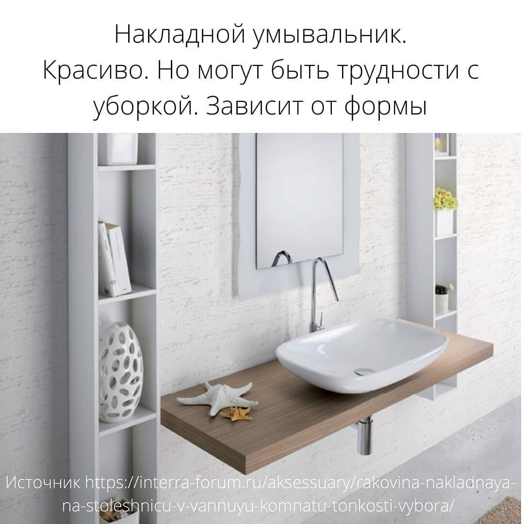 ❗При всей своей красоте накладной умывальник имеет один недостаток. Со слов очевидцев часто брызги воды выходят за пределы чаши, стекают по внешним стенкам и собираются в основании умывальника (труднодоступные места). Как пишут владельцы “чистить заколебешься”. И это особенно актуально, когда в доме дети, которые умываются как хрюшеньки. А у кого-то дети буквально висели на такой чаше, что пришлось ее заменить на обычную.